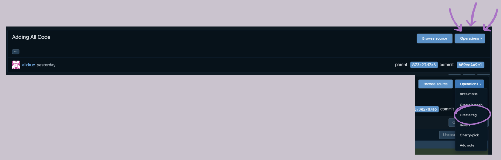 Once the new window opens, click on "Operations", select "Create Tag" in the dropdown menu and type in your version number (If this is the first version, v1.0).